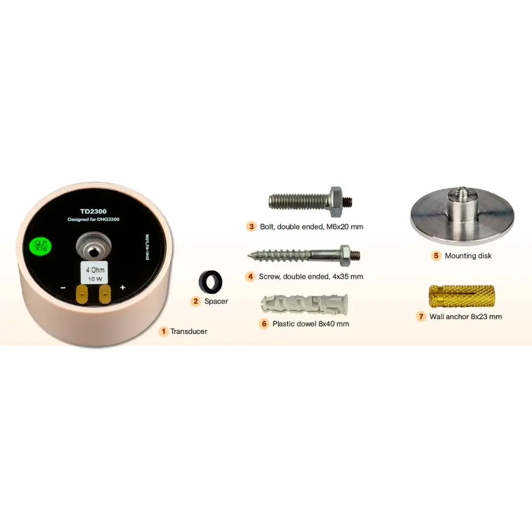 El transductor vibroacústico TD2300 es parte de un sistema completo de protección contra el espionaje. El TD2300 induce ruido en las paredes, pisos, techos, ventanas y otras superficies del edificio, previniendo la filtración de señales de sonido. Para garantizar un nivel suficiente de protección, el sistema consta de varios transductores instalados en diferentes estructuras de la habitación, conectados a un generador.